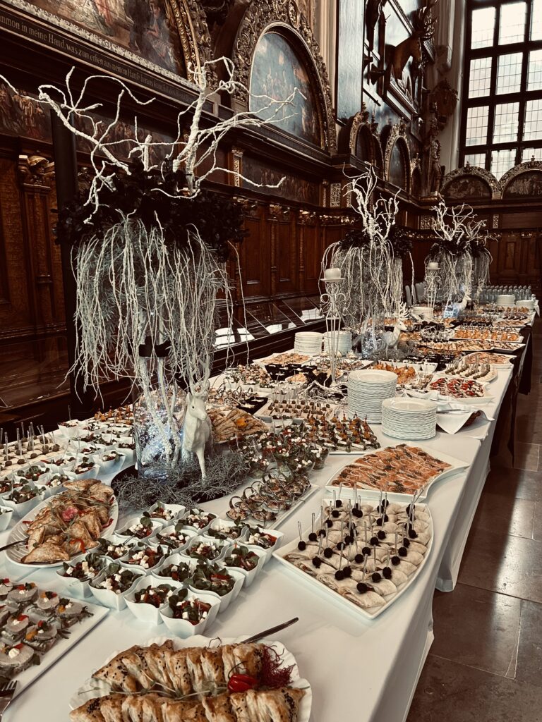 W menu znajdują się klasyczne zupy (barszcz, żurek, grzybowa, piwna), dania rybne (karp, sandacz, łosoś, krewetki), mięsa (zrazy, żeberka, de volaille), bigos, krokiety, sałatki, pierogi i uszka oraz mrożonki. Zamówienia można składać e-mailem do 12.12.2025. Wymagamy zadatku w wysokości 50%, płatność gotówką. Dostępna zastawa: jednorazowa (opłata za półmiski), ceramiczna (kaucja) lub własna. Minimalne ilości to m.in. zupy od 0,9 l, mrożonki od 0,5 kg.
